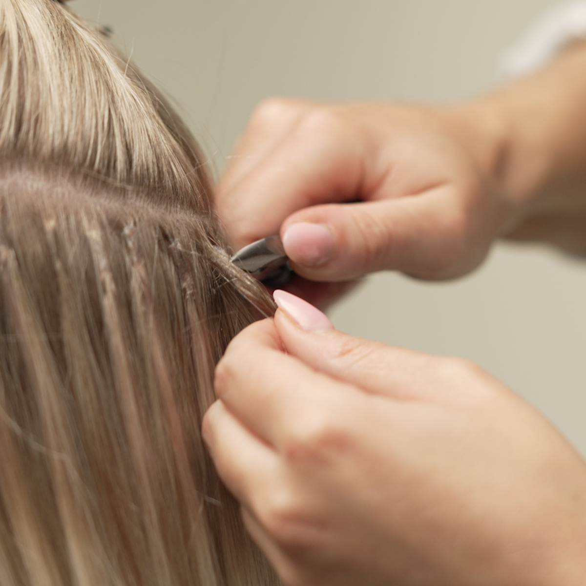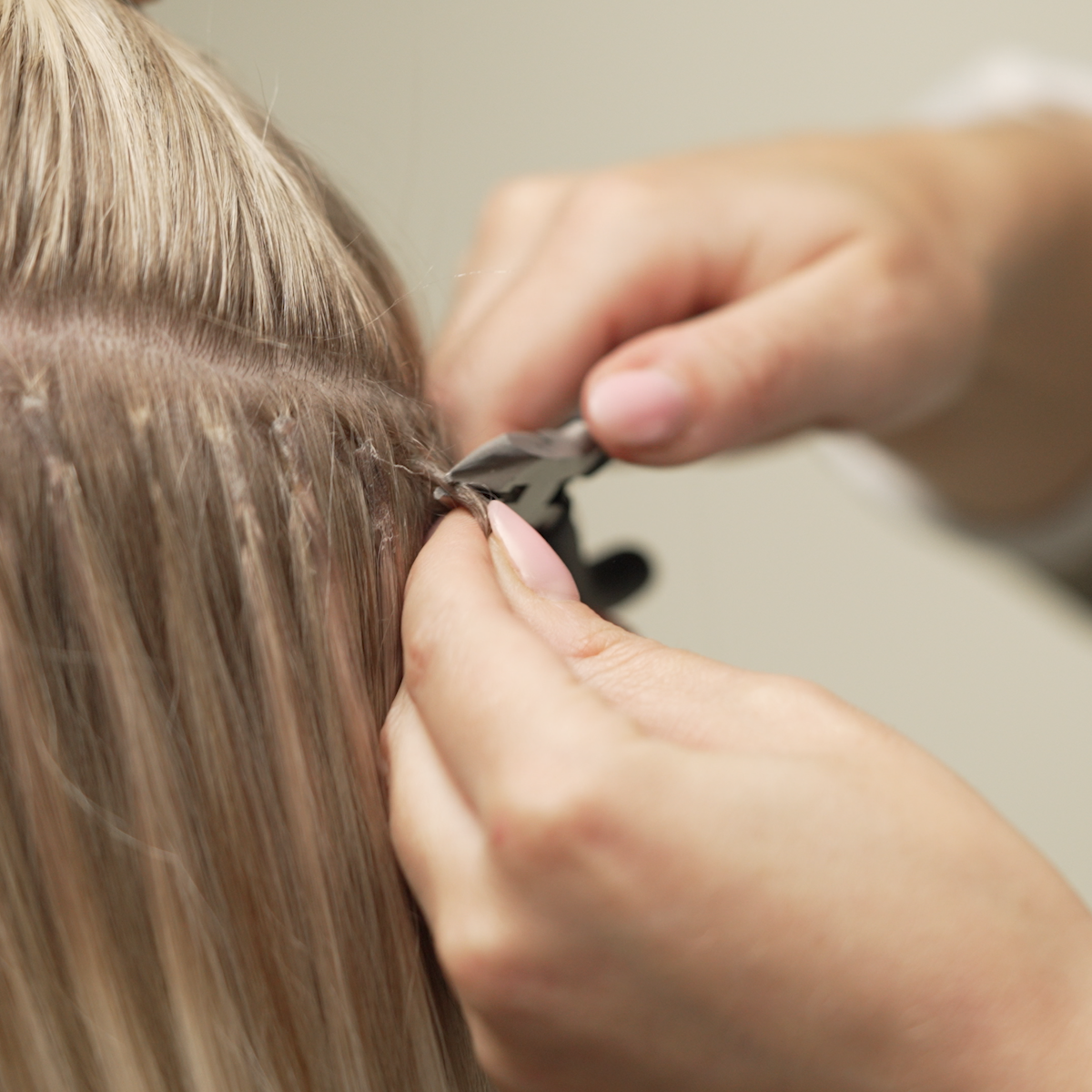 Na szczycie każdego pasemka keratynowego znajduje się mały fragment keratyny, który należy rozpuścić i owinąć wokół swoich własnych włosów.