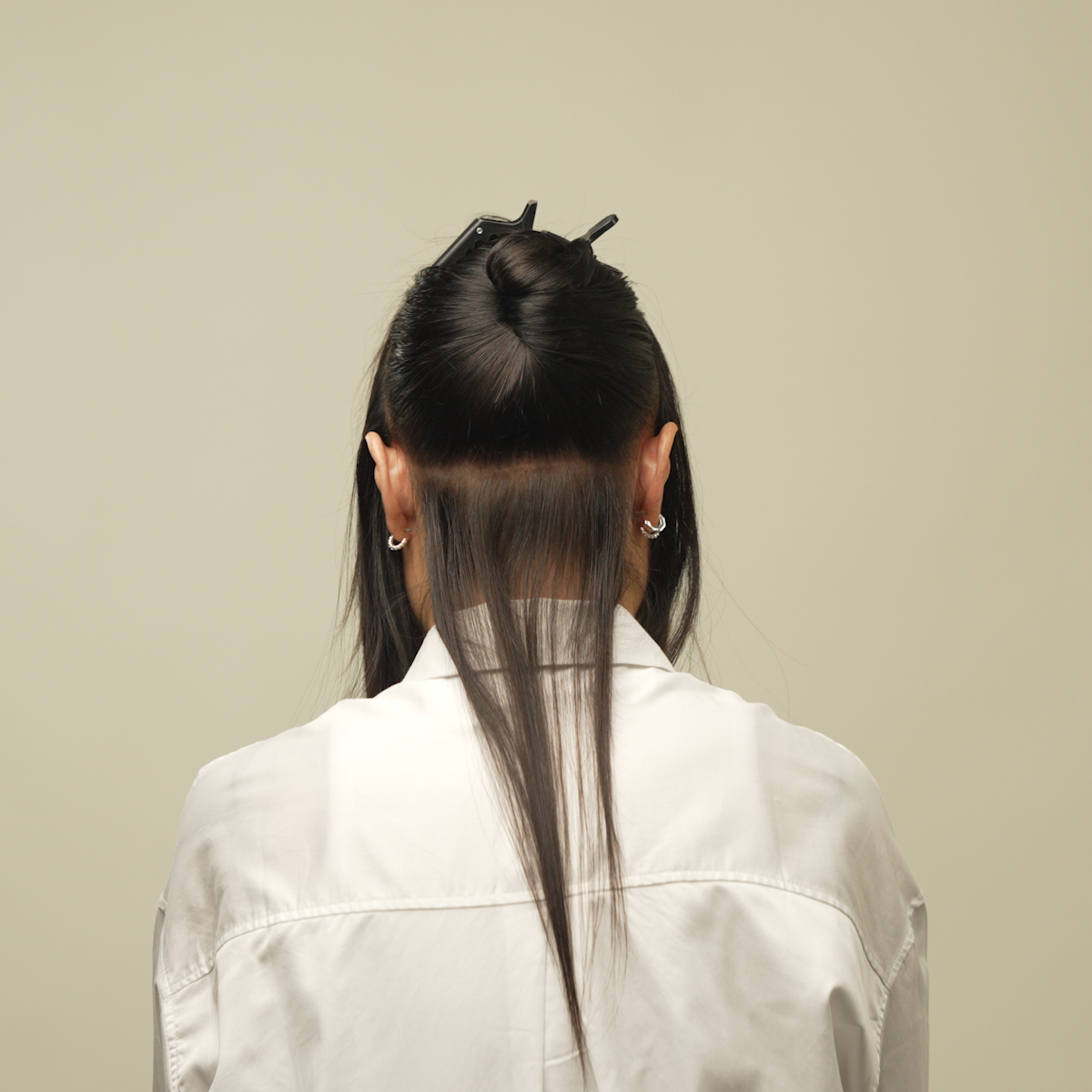 Na początek zrób poziomy przedziałek we własnych włosach około 3–5 centymetrów od linii włosów na karku. Zawsze zaczynaj od dołu – ułatwi to regulację podczas nakładania oraz kontrolę zarówno nad własnymi włosami, jak i przedłużeniami.